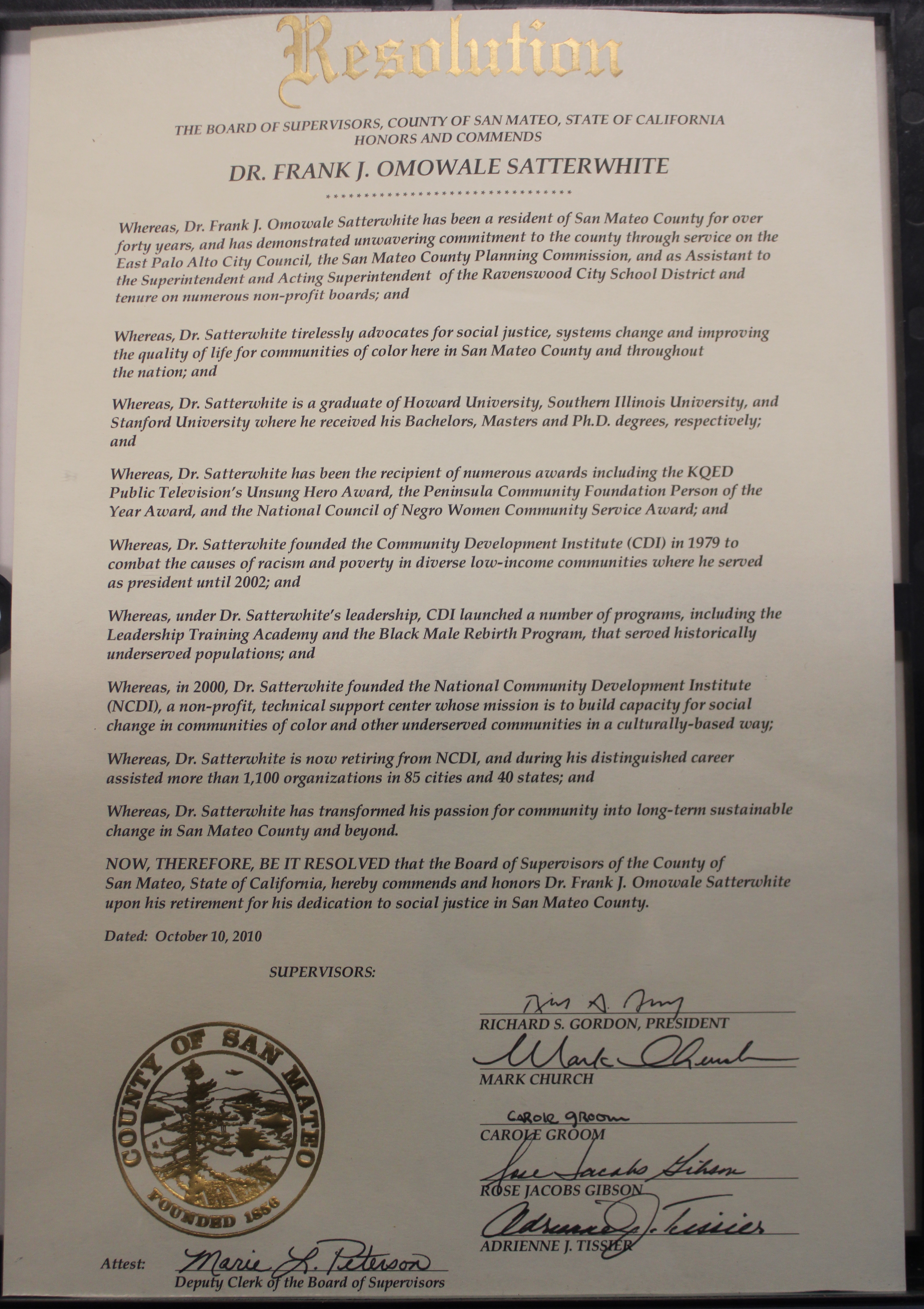 Resolution from San Mateo County Board of Supervisors honoring Dr. Omowale Satterwhite for his retirement. Mentions his dedication to implementing change in the community, awards he's received, and the foundation of CDI and NCDI.