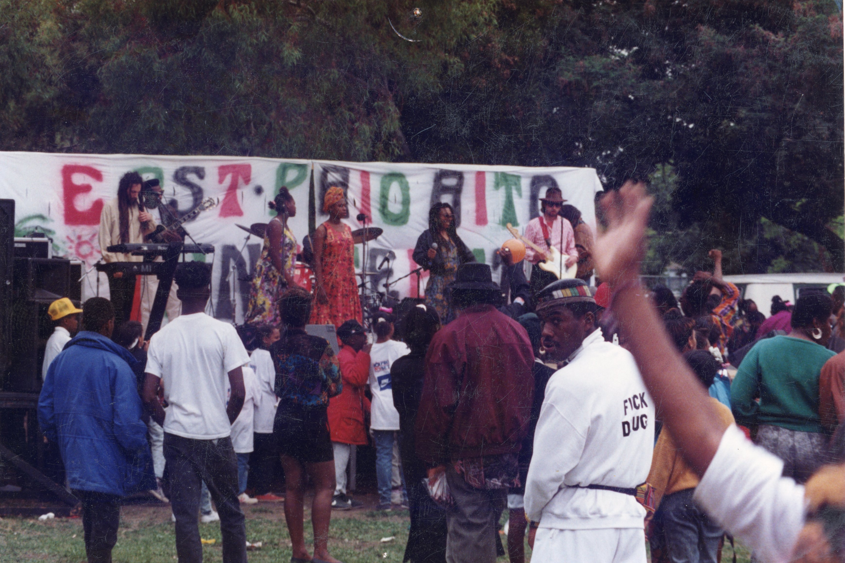Photographs of a band and dancers performing during the 1989 Juneteenth Festival at Bell Street Park in EPA.