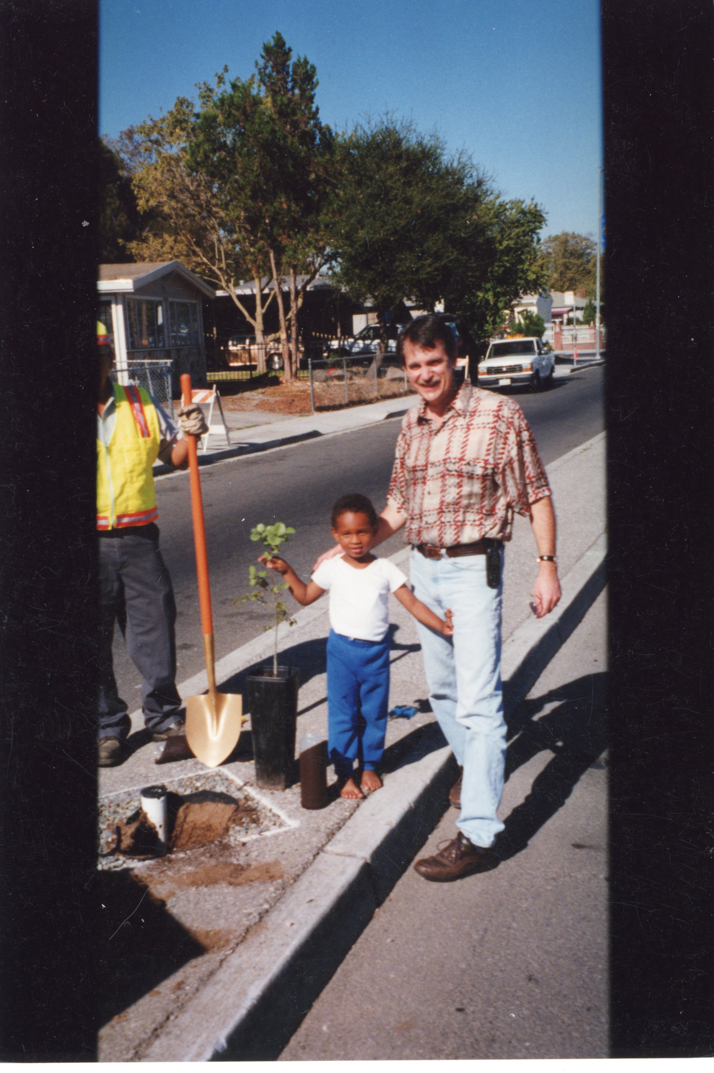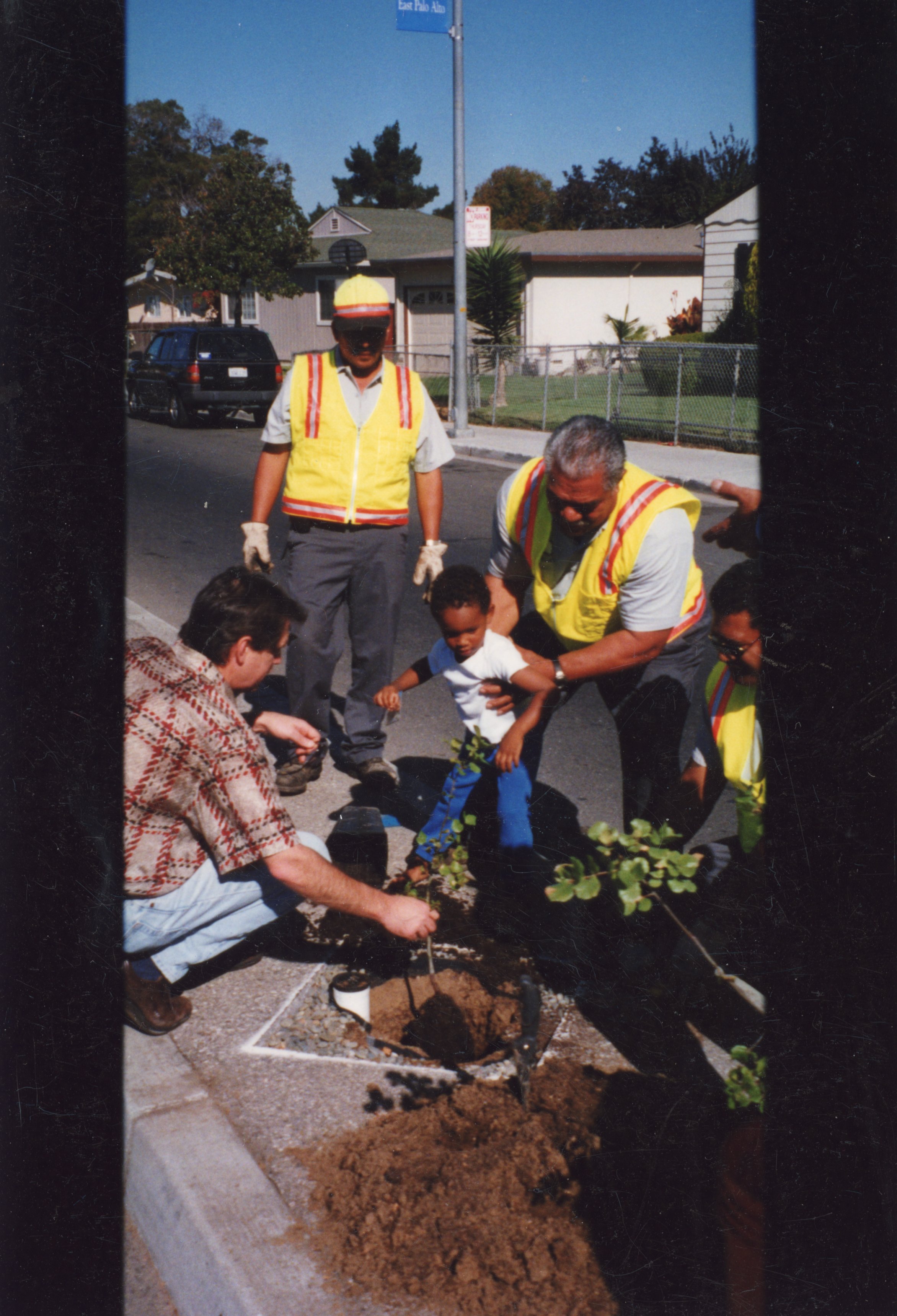 Photographs of Mayor Duane Bay with Khalil Ahmad and Al Teo during a tree planting effort on Newbridge Street.