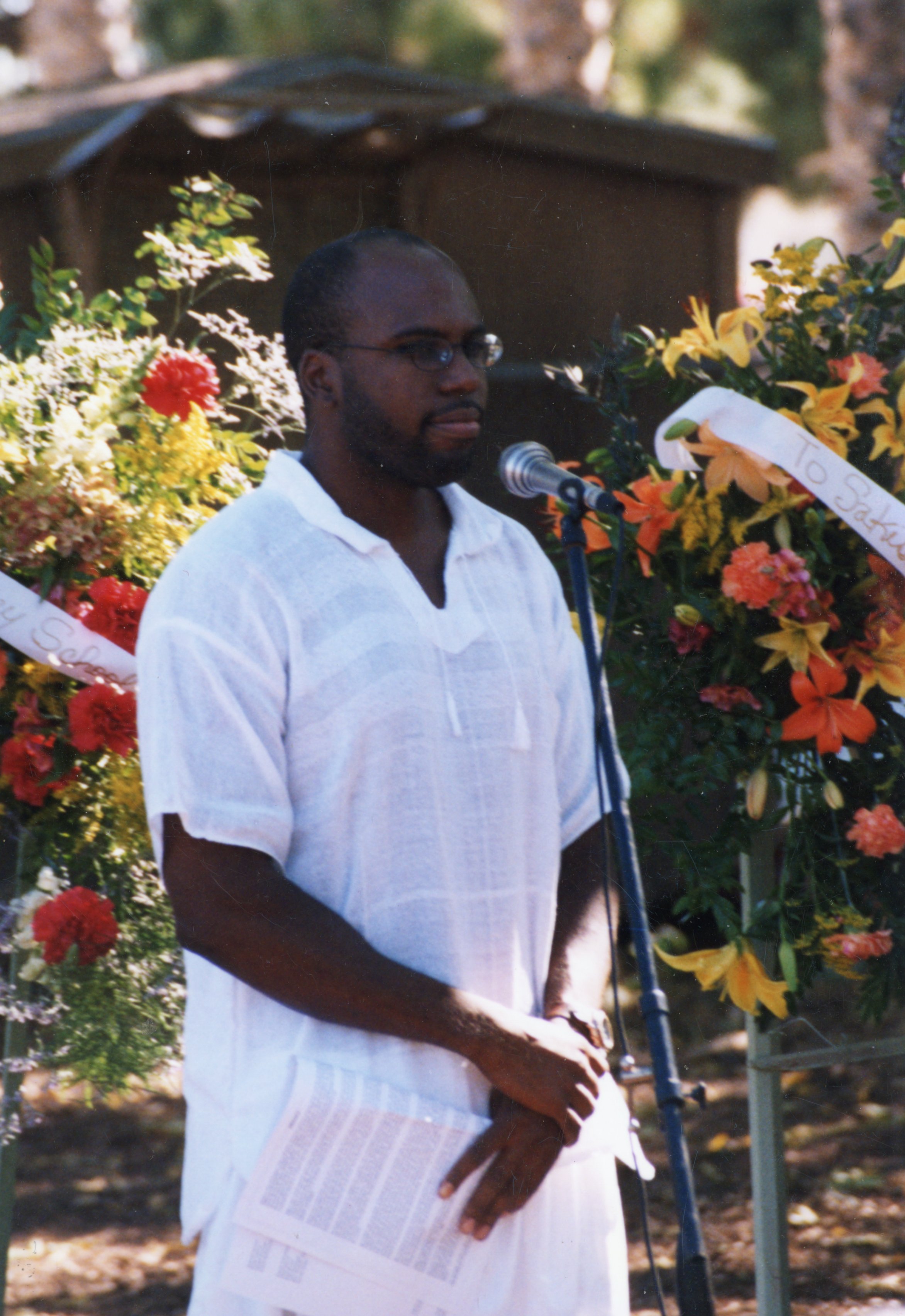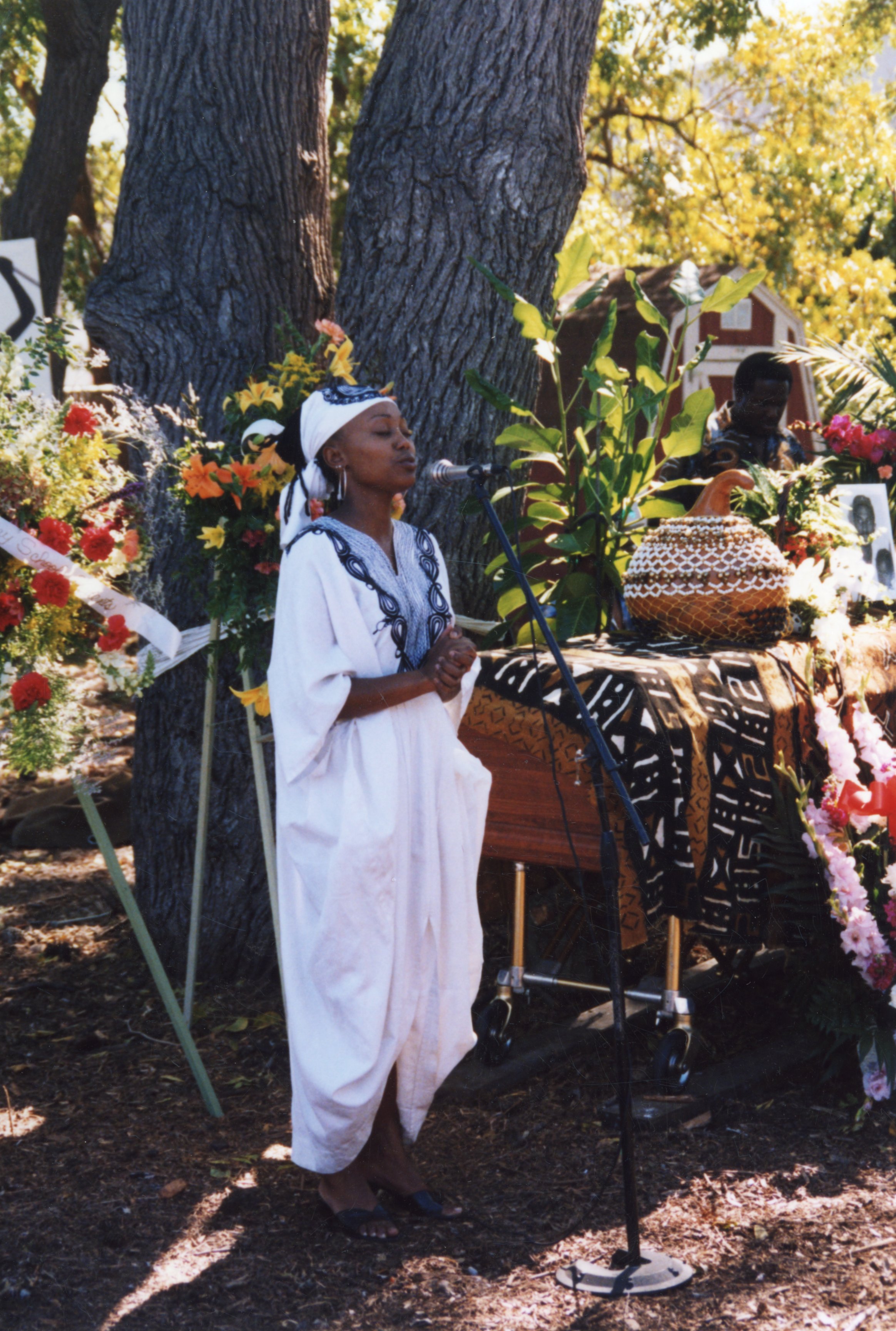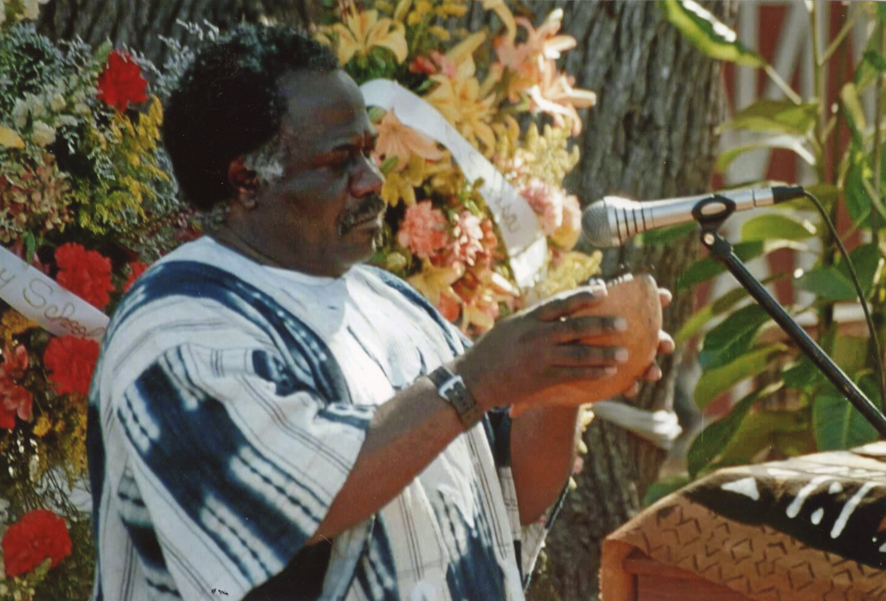 Public DepositedPhotographs from Sakisa Bayete's (aka Marlowe Dan Thompson) memorial held at a Beech Street property owned by Nairobi College. Featured attendees included Muki Isora, Nobantu Ankoanda, Malonga Casque Lord (founder of Fua dia Congo), Shadidi Harding, Tiffany Uhila, Senter Uhila, Shauna Uhila (part of the Pacific Islander tribute), Yasmeen Oakley, Rashida Knox, Dee Uhila, and Hakim Tendaji. Bayete moved to EPA in 1971. He was a political activist and former member of the Black Panther Party. He started the first drum class in the Ravenswood City School District in 1976 and was the director of the Belle Haven Music and Dance Ensemble. He worked for the school district for seven years as an assistant principal and math lab assistant. He was a poet, master drummer, sculptor, and singer. Many will also remember him as the South African Boot Dance instructor. He also worked with many Rites of Passage groups for young black males. He was a drummer for Fua Dia Congo and Wajumbe African American Dance Company, among other roles. He was also music director for the Kuumba Dance Ensemble at Stanford University. His objective in life was to develop a fine arts and performing arts complex in East Palo Alto to celebrate the ethnic and cultural diversity of the community.