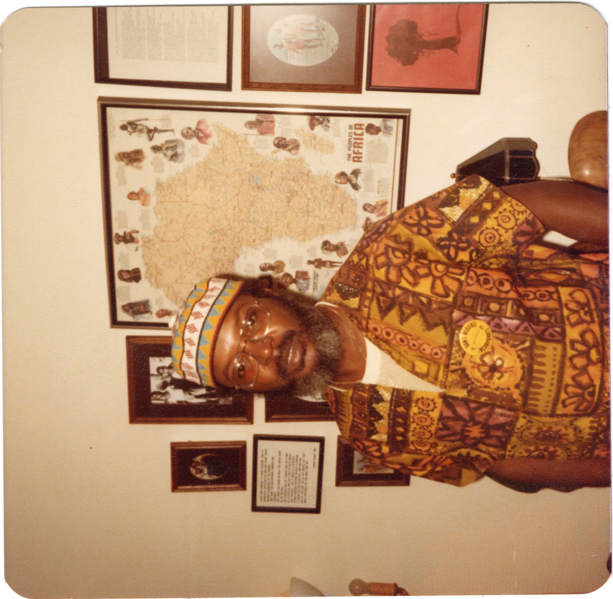 Photograph of Dr. Omowale Satterwhite wearing an EPACCI pin and in front of a "Peoples of Africa" poster.