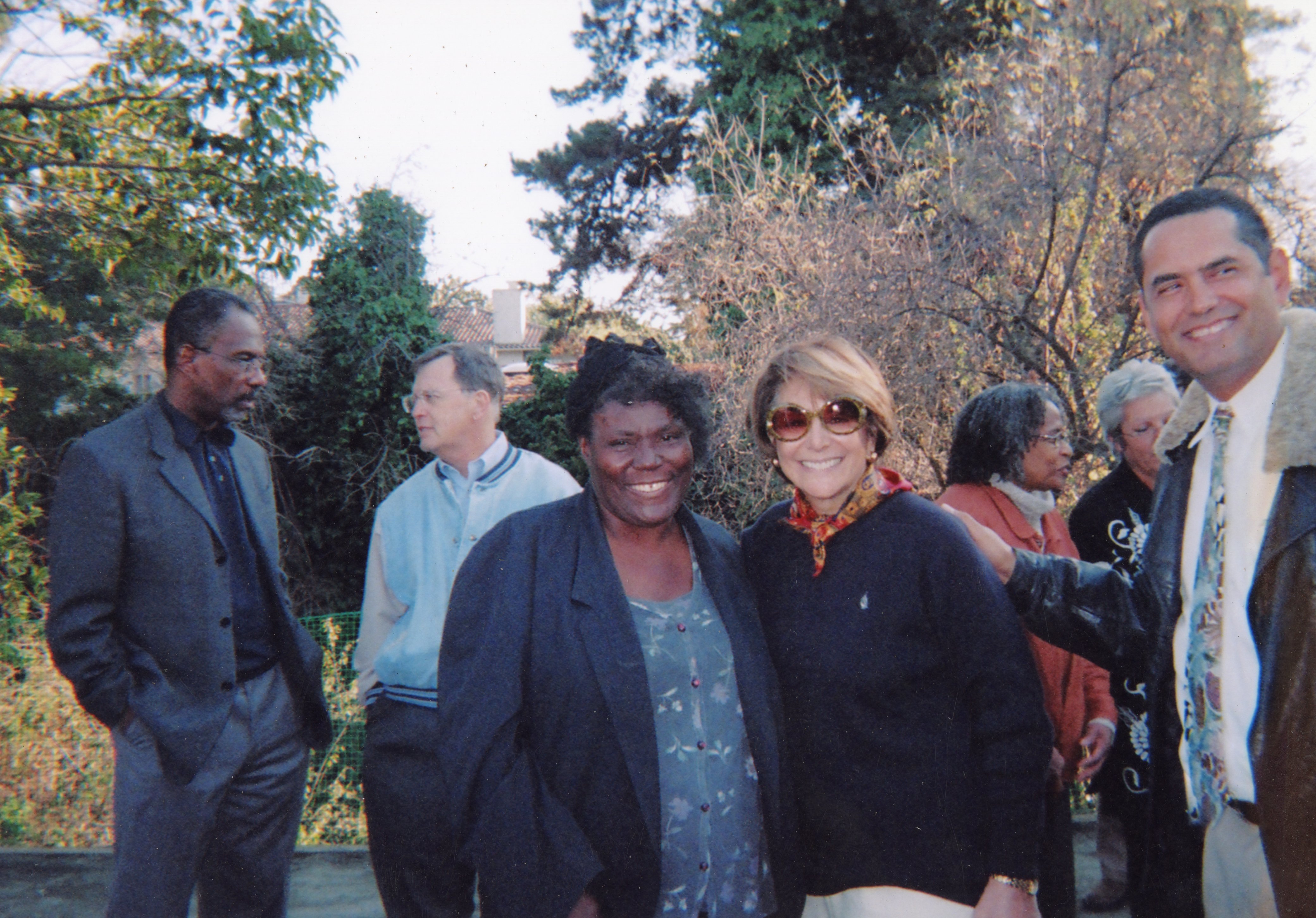 Photograph featuring Elizabeth Jackson with Congresswoman Anna Eshoo. Figures in back include EPA City Manager Alvin James, Frank Benest (City Manager of Palo Alto), EPA Councilwoman Pat Foster, Cynthia D'Agosta (ED San Francisquito Creek JPA), and Carlos Martinez (EPA city staff).