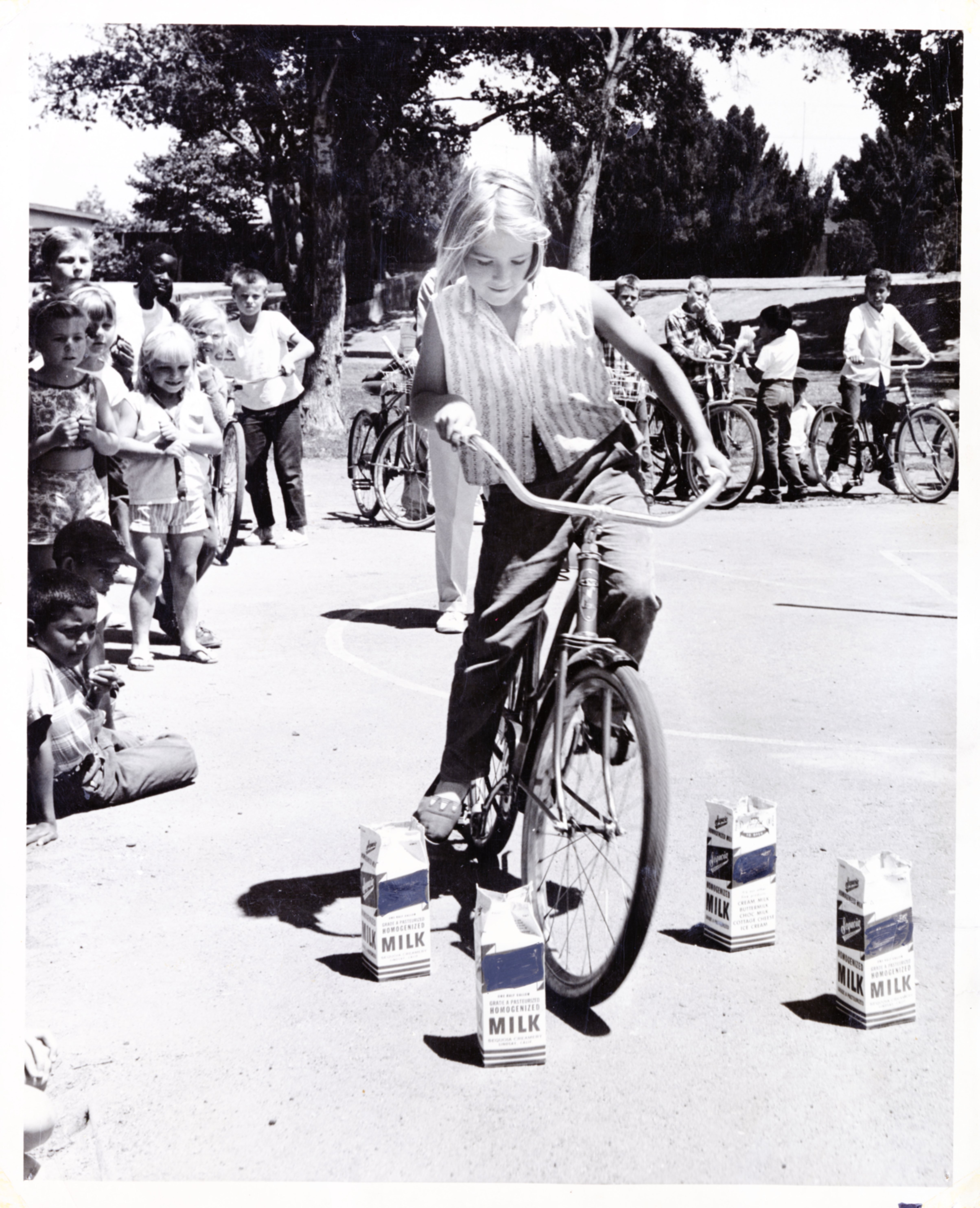 Photograph of young girl Melody Kamlade biking in the Jack Farrell Park Bike Rodeo in East Palo Alto. Photograph featured in the Palo Alto Times.