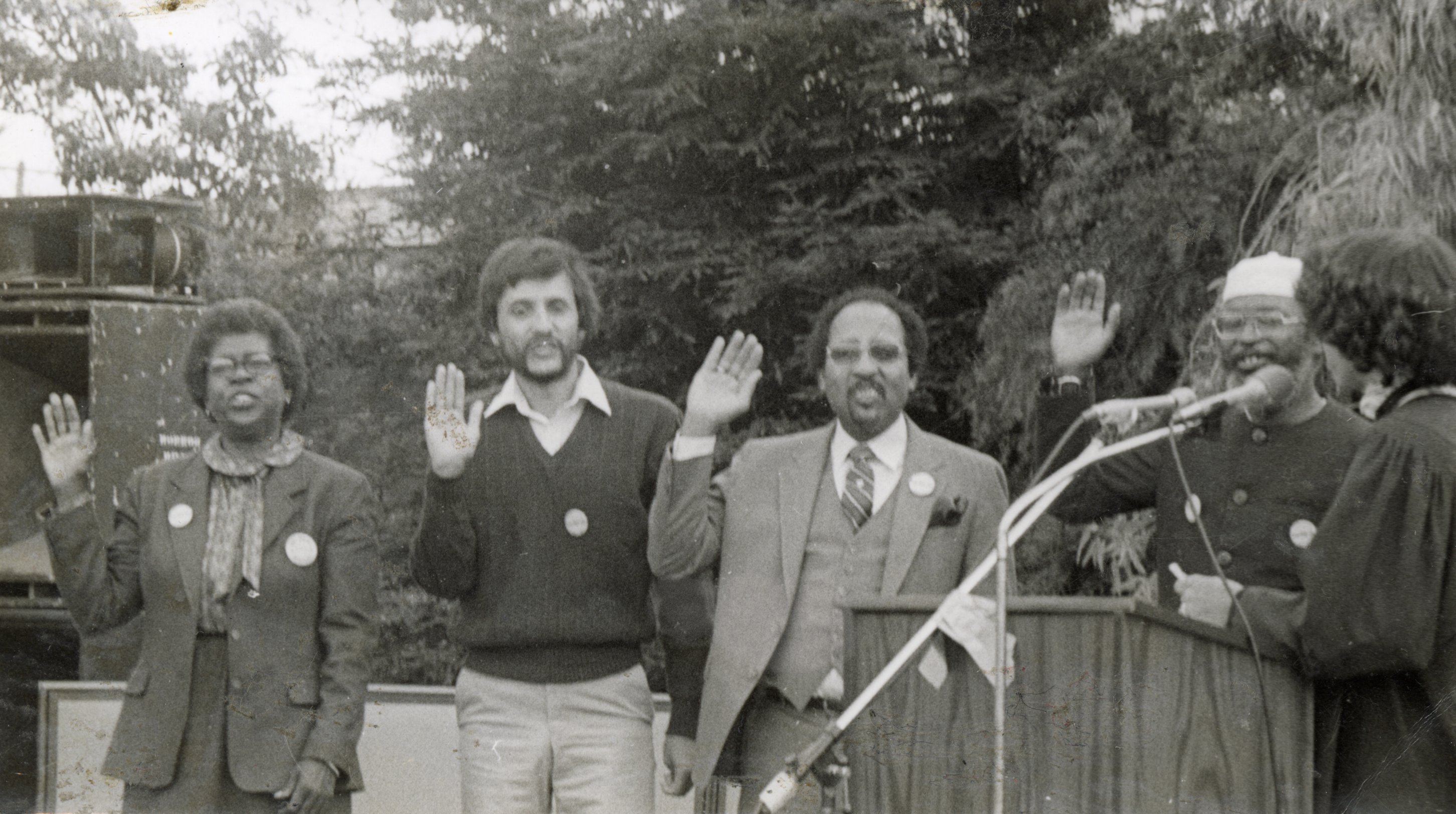 Photograph of Barbara Mouton, Ruben Abrica, James Blakey, and Omowale Satterwhite being sworn into the first EPA City Council by Judge LaDoris Cordell during a ceremony at Bell Street Park. Councilwoman Gertrude Wilks was sworn in during a separate ceremony.