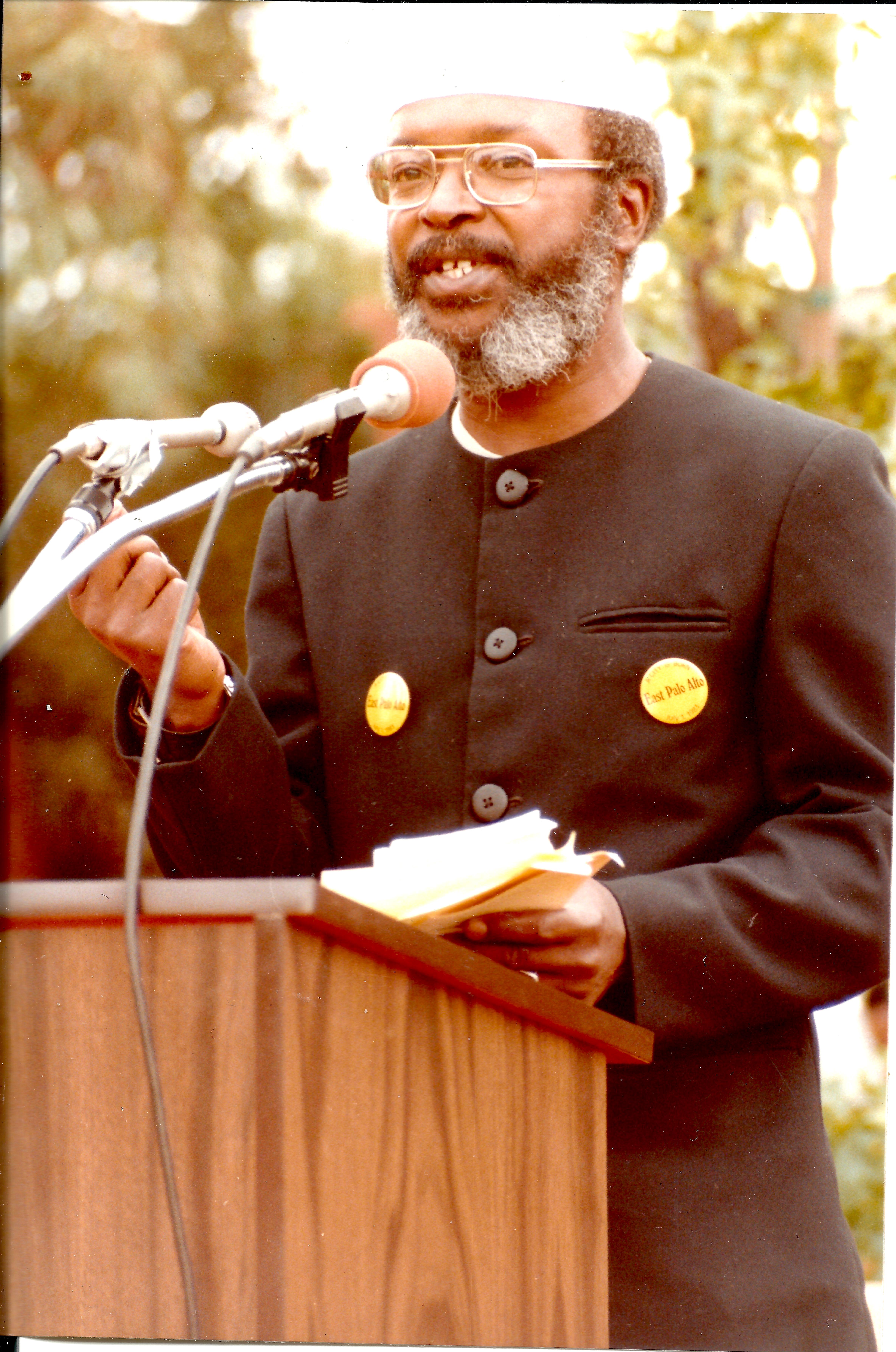 Photo of Dr. Omowale Satterwhite taken at the first City Council swearing-in ceremony held at Bell Street Park on July 1, 1983.