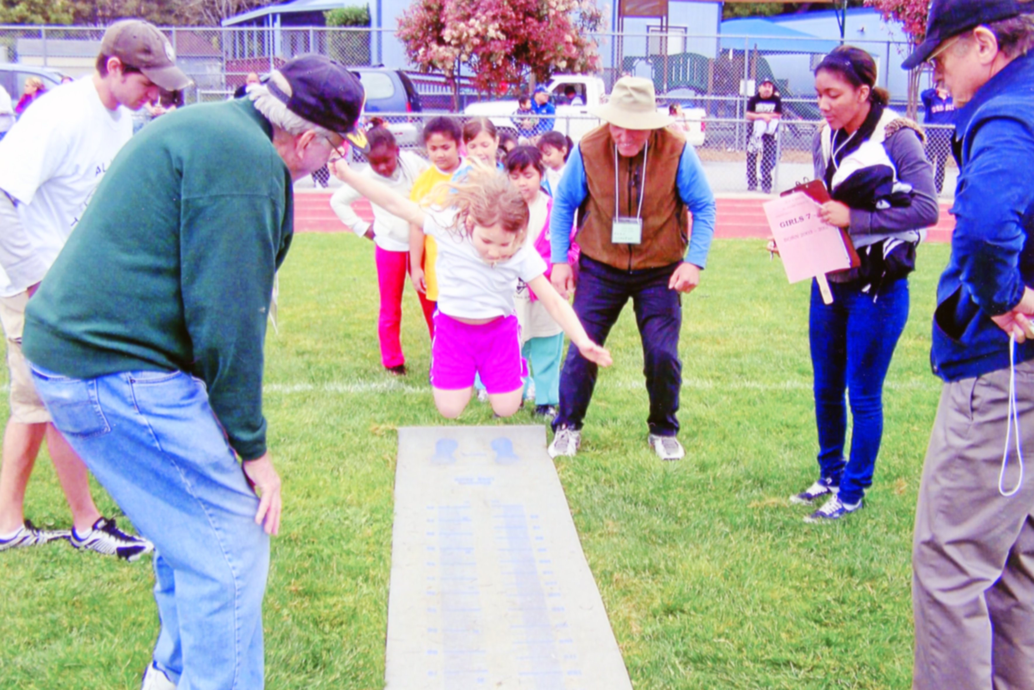 Photograph of a young girl participating in the long jump at the Al Julian Track Meet.
