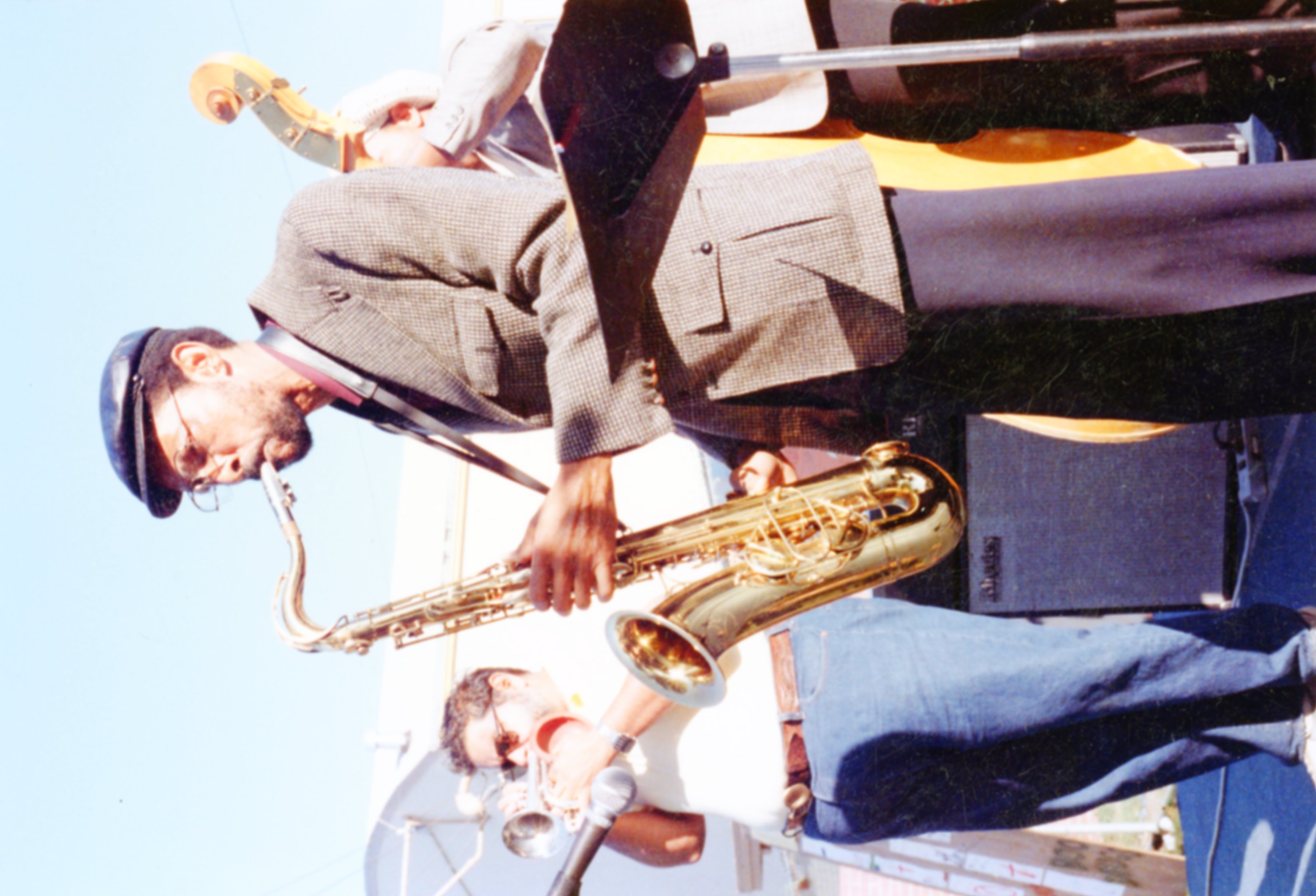 Photograph of Aaron Maganello playing saxophone at an 1986 Anti Drug Fair in East Palo Alto.