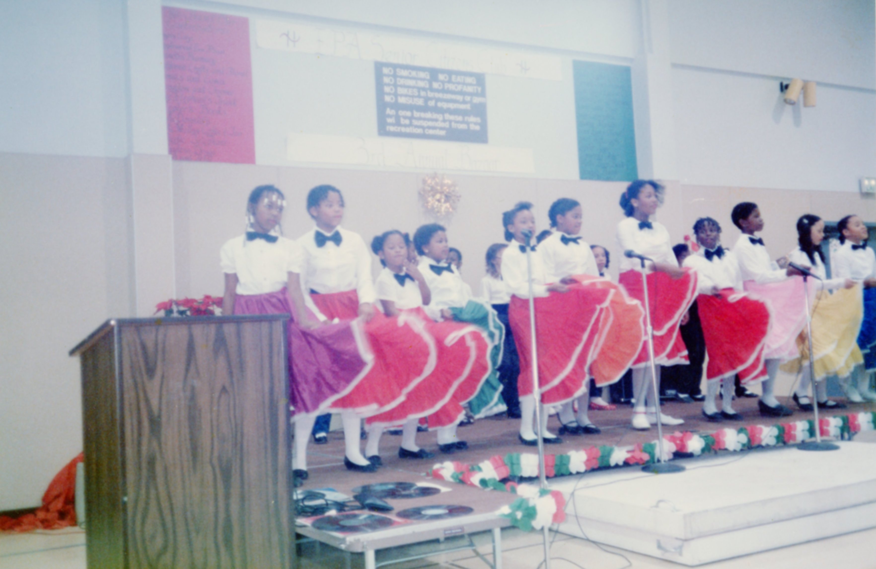 Photograph of Ravenswood City School District students performing at the 3rd Annual Christmas Bazaar held at the EPA Senior Citizens Club.