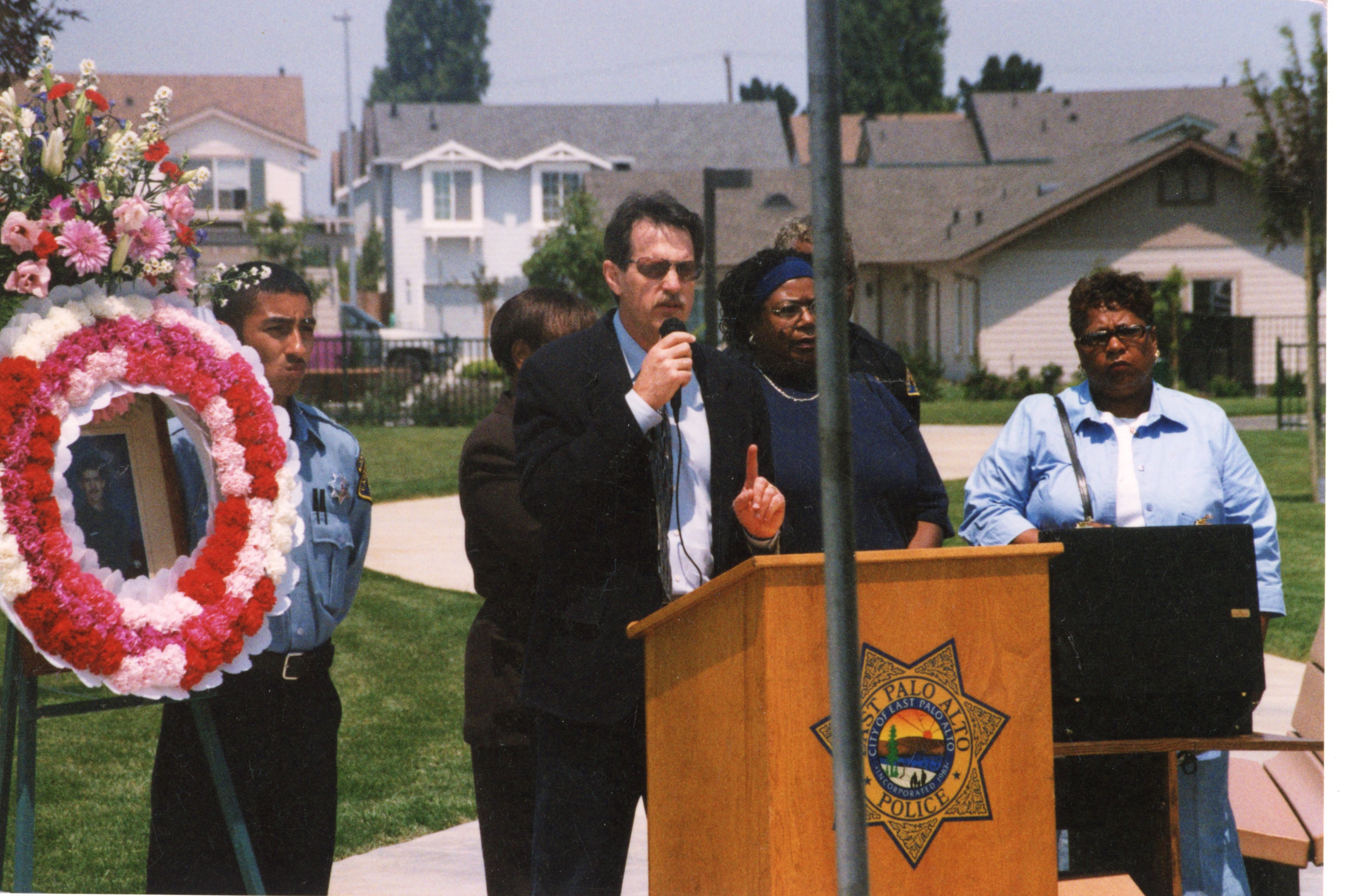 Photograph of the dedication of Joel Davis Park in EPA. Depicts Duane Bay at the podium with members of the EPA City Council behind him.