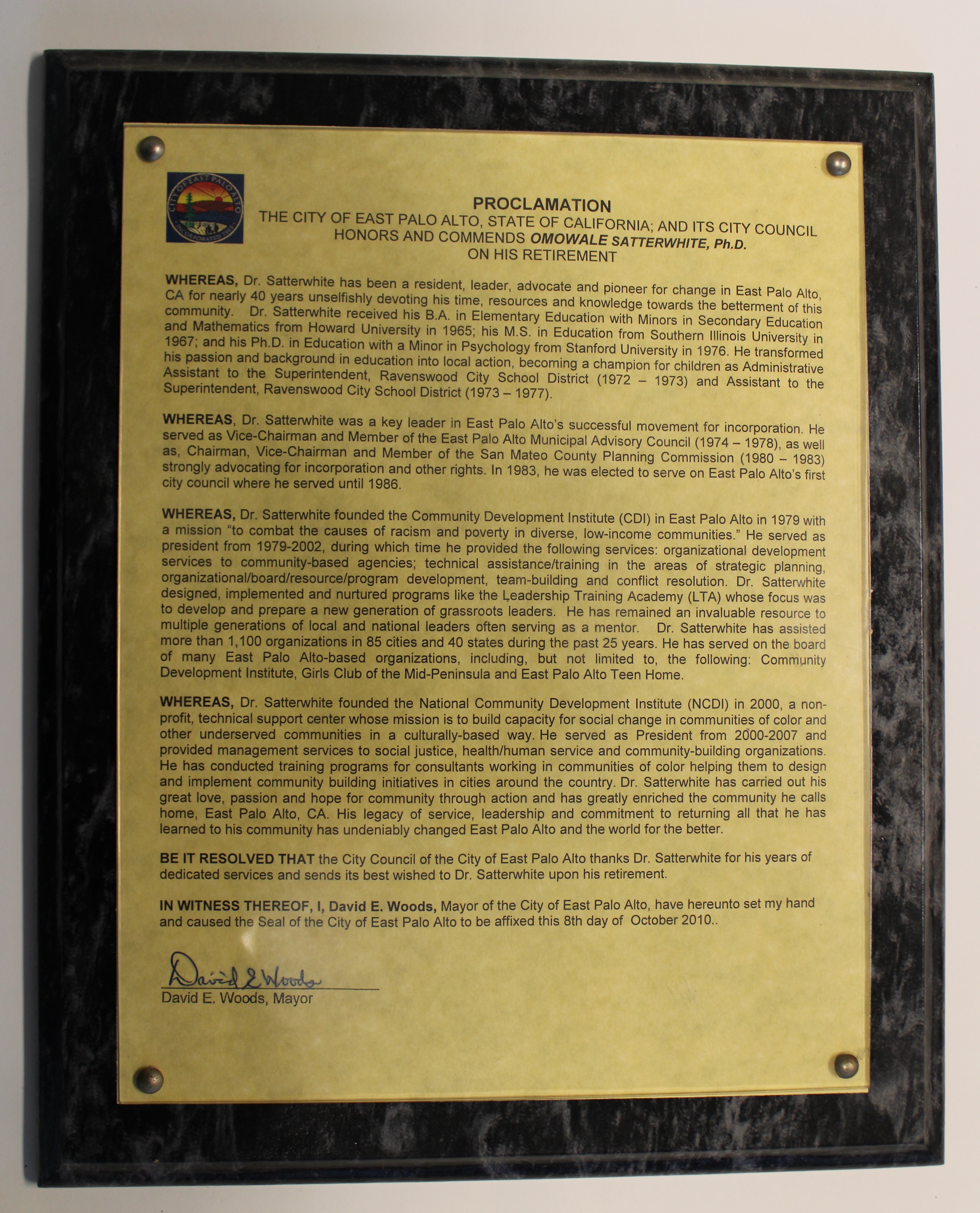 Proclamation from the City of EPA Honoring Dr. Omowale Satterwhite