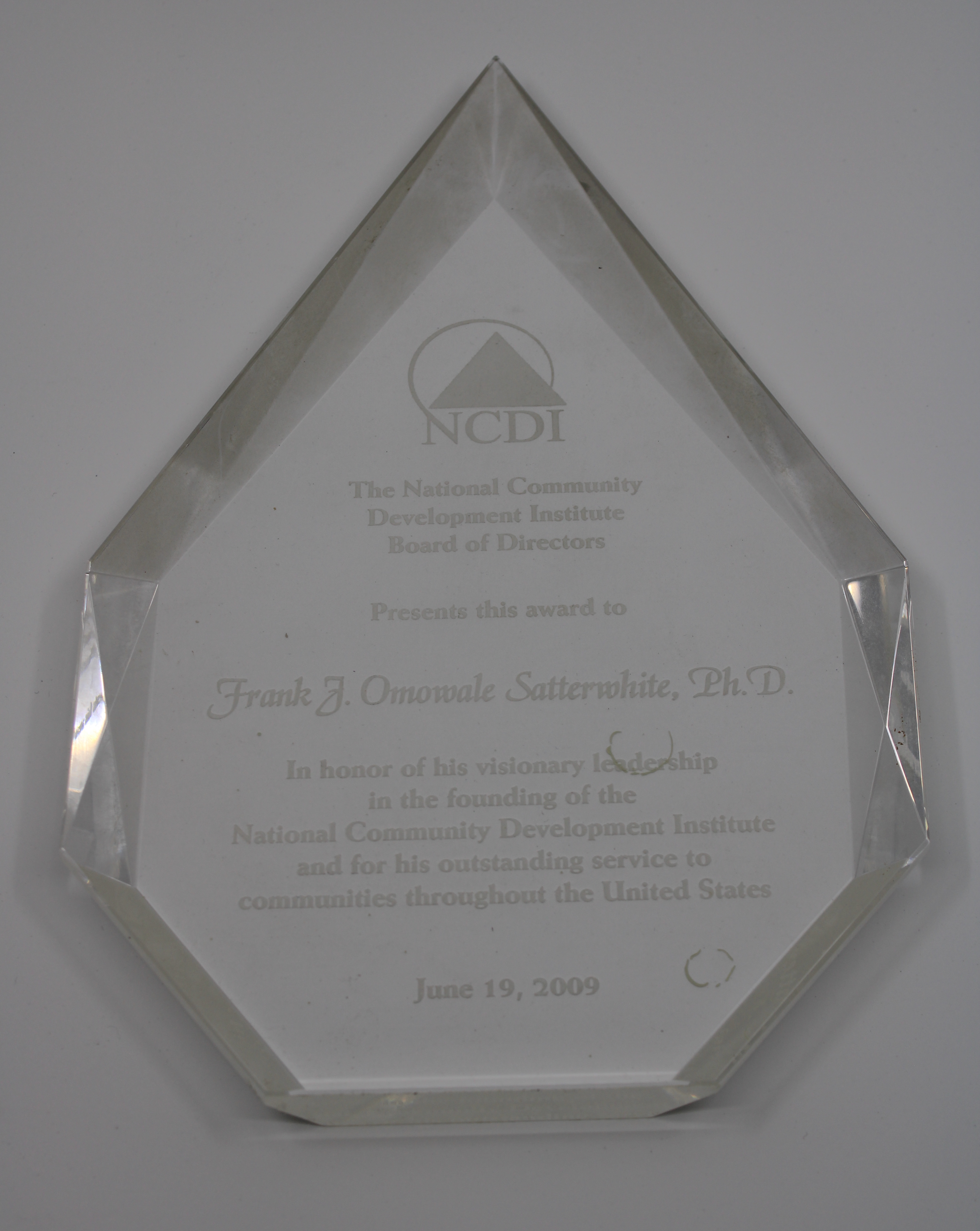 Award from NCDI Board of Directors honoring Dr. Omowale Satterwhite's leadership in the foundation of NCDI and his service to communities across the US.